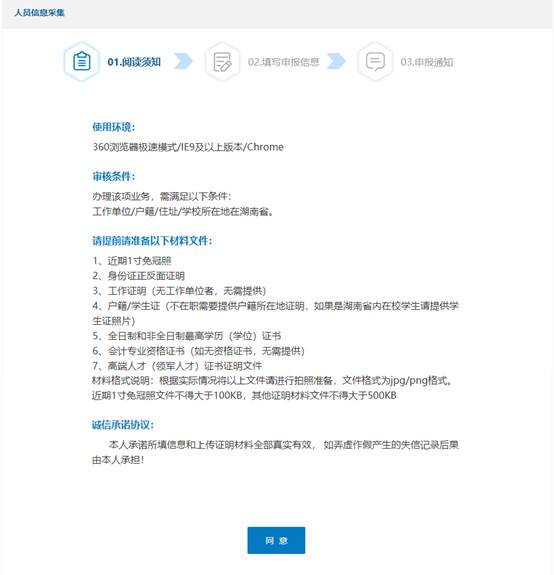“閱讀須知”頁(yè)面中,寫(xiě)明了會(huì)計(jì)人員辦理此項(xiàng)業(yè)務(wù)中,需要注意的事項(xiàng)以及需要提交的資料, 確認(rèn)無(wú)誤以后,點(diǎn)擊【同意】按鈕進(jìn)入“”頁(yè)面。