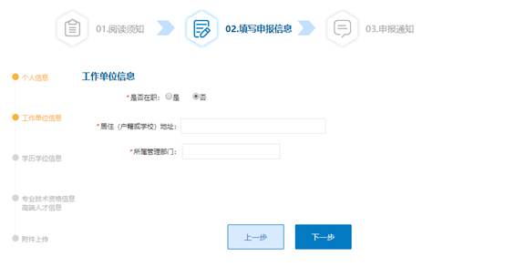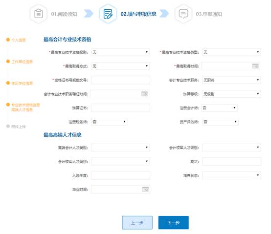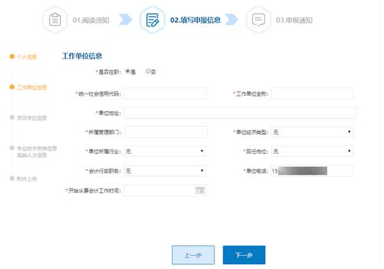 【是否在職】,選擇“否”,則顯示以上頁(yè)面,申報(bào)人自主填寫(xiě)各項(xiàng)信息,帶“*”的項(xiàng)為必填項(xiàng)。 并自主進(jìn)行選擇對(duì)應(yīng)的會(huì)計(jì)管理部門(mén),如有疑問(wèn),請(qǐng)向會(huì)計(jì)管理部門(mén)咨詢(xún)。 確認(rèn)以上信息無(wú)誤后,點(diǎn)擊【下一步】按鈕,進(jìn)入下一個(gè)頁(yè)面。