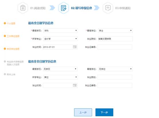 “學(xué)習(xí)信息”頁(yè)面,全日制學(xué)習(xí)信息為必填信息,如有非全日學(xué)習(xí),申報(bào)人需自主完善相應(yīng)信息(注意學(xué)習(xí)信息請(qǐng)?zhí)顖?bào)已獲得的所屬類(lèi)型的最高學(xué)習(xí))。確認(rèn)以上信息無(wú)誤后,點(diǎn)擊【下一步】按鈕,進(jìn)入下一個(gè)頁(yè)面。